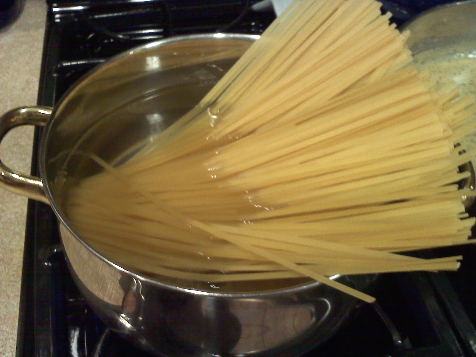 Add the cooked linguine into the pan with the Alfredo Extraordinaire. It is OK if a little pasta water gets in, it makes the sauce a bit thinner.